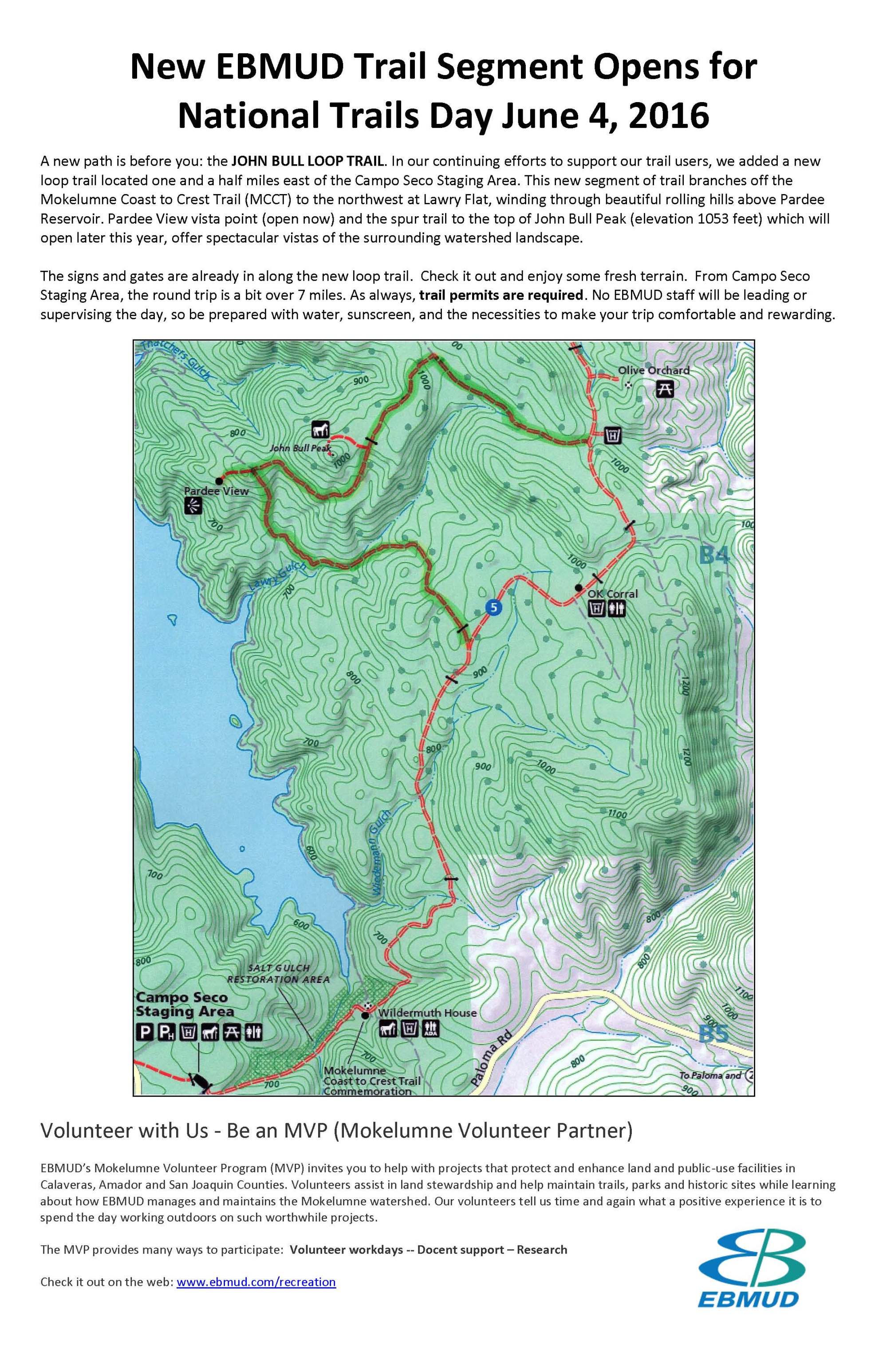 John Bull Trail is now open in MCCT’s Camanche-Pardee segment near Valley Springs in the Sierra Foothills. EBMUD’s announcement: