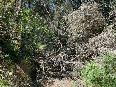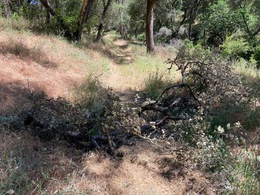 Trail supporter Tina reports two trees are down (she also sent in these photos) on Rich Gulch trail this afternoon, that for now makes the trail impassable. EBMUD is sending out maintenance crew to attend to it. Please call EBMUD Sierra Trails office at 209-772-8204 to get updates if you plan to head out there today or anytime this week. We do not have a time estimate for when the trail will be clear. Thank you Tina!